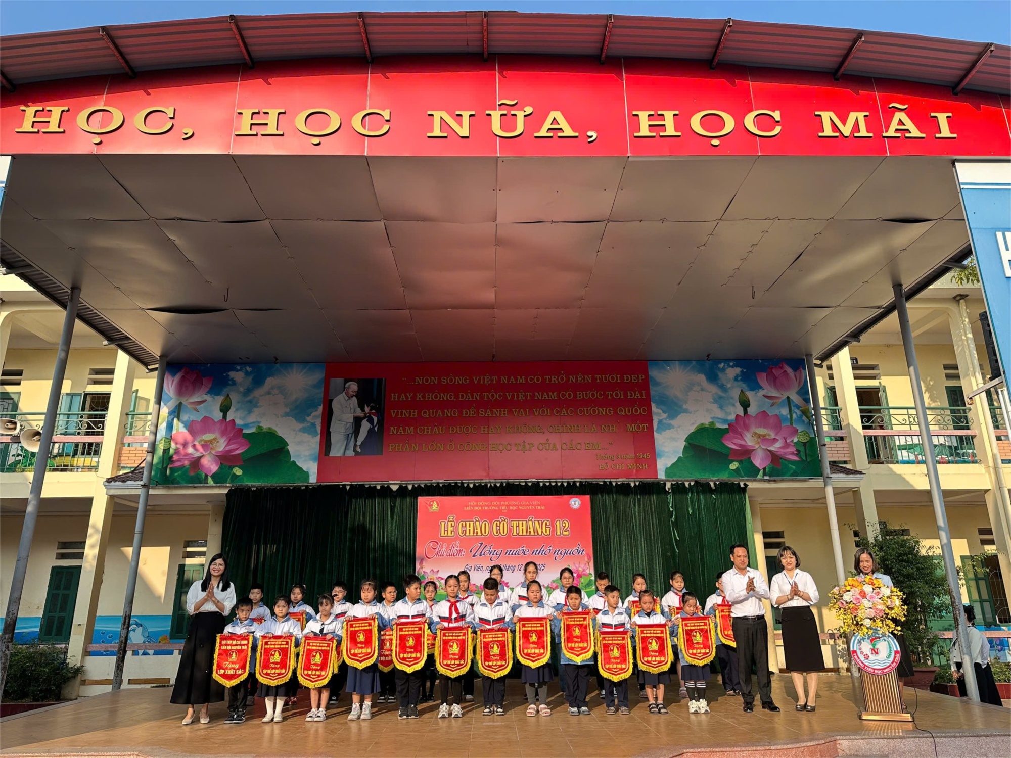 Tại buổi lễ, Liên đội đã nhận xét và tổng kết các hoạt động phong trào tháng 11/2025, biểu dương những tập thể và cá nhân tiêu biểu trong học tập – rèn luyện. Trong đó, nhiều chi đội và lớp nhi đồng đã xuất sắc đạt danh hiệu “Chi đội 3 tốt” và “Gương thiếu nhi tiêu biểu làm theo 5 điều Bác Hồ dạy”. Nhà trường đã trao 25 lá cờ xuất sắc cho các tập thể tiêu biểu, ghi nhận sự nỗ lực không ngừng của giáo viên và học sinh trong tháng qua.