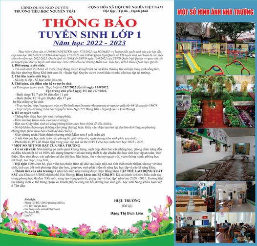 Thực hiện Công văn số 550/SGD ĐT-KTKĐ ngày 17/3/2022 của SGD&ĐT v/v hướng dẫn tuyển sinh vào các lớp đầu cấp năm học 2022 - 2023; Kế hoạch số 37/KH-UBND ngày 17/2/2022 của UBND Quận Ngô Quyền về KH tuyển sinh và chuẩn bị các điều kiện cho năm học 2022 - 2023; Quyết định số 1091/QĐ-UBND ngày 10/6/2022 của UBND Quận Ngô Quyền v/v giao chỉ tiêu kế hoạch giáo dục và tuyển sinh năm học 2022 - 2023 cho các trường Mầm non, Tiểu học, THCS thuộc Quận Ngô Quyền. Trường Tiểu học Nguyễn Trãi Thông báo tuyển sinh lớp 1 năm học 2022 - 2023 như sau: