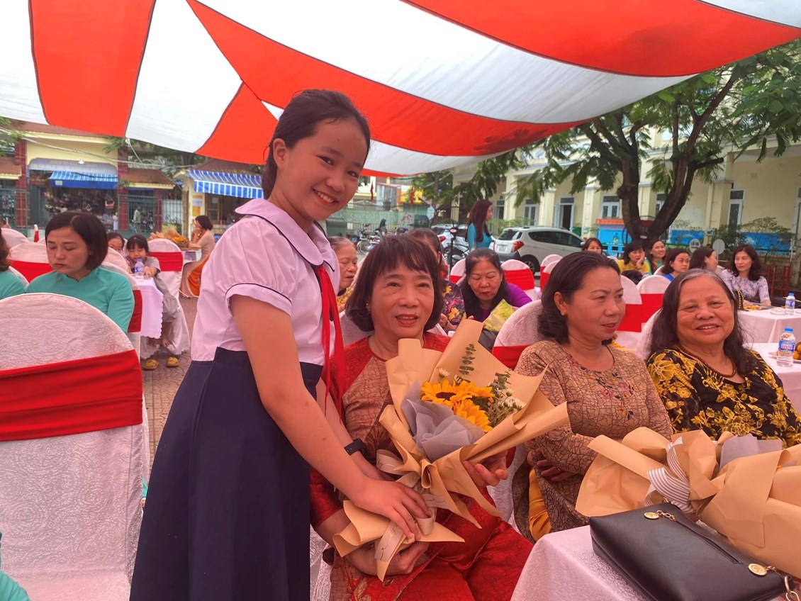 Các em học sinh khối 5 đại diện cho hơn 1000 học sinh nhà trường lên tri ân các thầy cô giáo đã từng giảng dạy, công tác tại trường, về dự Lễ kỉ niệm bằng lời ca tiếng hát và những bó hoa tươi thắm.