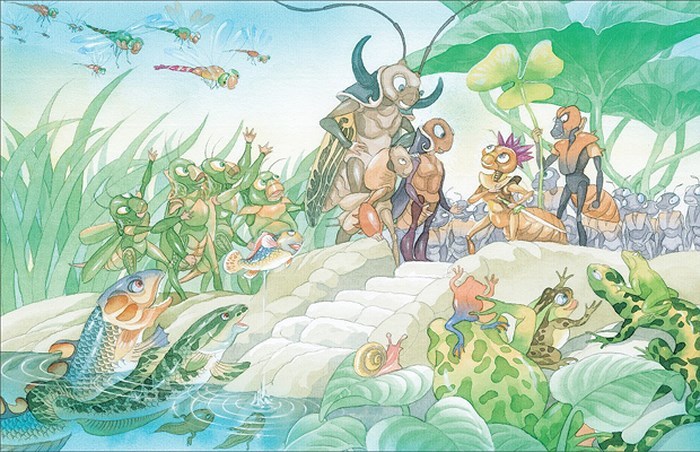 Sau có Nhái Bén trông thấy chúng tôi. Nhái Bén tính nhau nhảu liền ra bảo ễnh ương đi rong khắp nơi đánh lệnh vang vang rao cho cả làng nước biết có người lạ vào địa phận. Thế là, cả xóm lô nhô kéo ra. Trông những cái bụng lép và nét mặt vêu vao, tôi đoán biết họ kéo ra làm gì. Họ ra xem chúng tôi có gì cho ăn hoặc chúng tôi có phải là thức ăn được không. Nhưng thấy chúng tôi sừng bướng, đầu mình bọc giáp sắt, chân mang khí giới nhọn hoắt thì họ lại lờ vờ lảng dần.