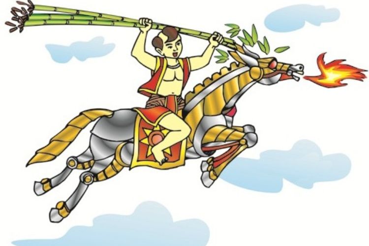 “Thánh Gióng” là truyện cổ tích Việt Nam quen thuộc với hầu hết mọi người. Chuyện kể từ thời vua Hùng thứ sáu có hai vợ chồng lương thiện nhưng mãi vẫn chưa có con. Một hôm người vợ ra đồng nhìn thấy một dấu chân rất to, bà ướm thử chân mình lên đó và khi về nhà thì bất ngờ mang thai. Sau mười hai tháng, bà đã sinh hạ một cậu bé và đặt tên là Gióng. Nhưng đến năm 3 tuổi mà cậu vẫn nằm ngửa đòi ăn, không biết ngồi, không biết lẫy, cũng không biết nói hay cười.