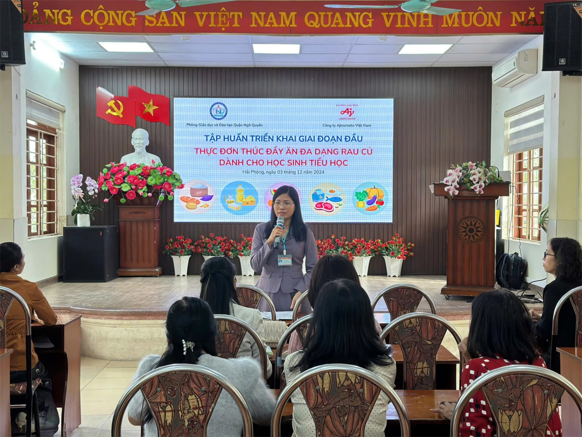 Thực hiện theo Công văn số 3517/SGDĐT-GDTH của Sở Giáo dục và Đào tạo (GD&ĐT) Thành phố Hải Phòng về việc nhất trí với đề xuất của Công ty Ajinomoto Việt Nam trong việc triển khai giai đoạn đầu thực đơn thúc đẩy ăn đa dạng rau củ dành cho học sinh tiểu học tại quận Ngô Quyền thành phố Hải Phòng. Ngày 3/12/2024, sau khi tham gia buổi hướng dẫn về cách chế biến thực đơn đa dạng rau củ đảm bảo dinh dưỡng và ngon miệng của Công ty Ajinomoto Việt Nam phối hợp với Phòng GD&ĐT quận Ngô Quyền, nhà trường đã tổ chức tập huấn triển khai giai đoạn đầu thực đơn thúc đẩy ăn đa dạng rau củ dưới dạng sổ tay “Nhật ký ước mơ - Vẹn tròn dinh dưỡng, Vững bước tương lai” và nguyên liệu giúp ăn rau củ ngon hơn từ Công ty Ajinomoto Việt Nam, để học sinh tiếp tục ăn đa dạng rau củ trong mỗi bữa ăn tại nhà cho cán bộ giáo viên, nhân viên nhà trường.